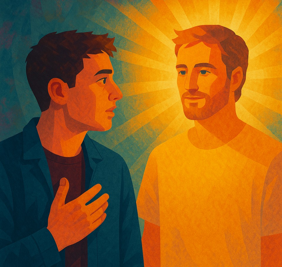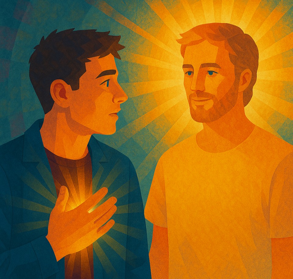 The release of forgiveness is like nothing he has experienced before. The more he lives and functions from this experience, the more he becomes aware of a shift in his perception of himself. He no longer perceives darkness, sin, and all that’s wrong when he looks within. He has also stopped feeling superior, different, and separate from his friend, or anyone else for that matter. As shown in the above illustration, it’s as if that same golden light he perceived in the other person is now glowing and growing within his own heart.